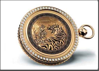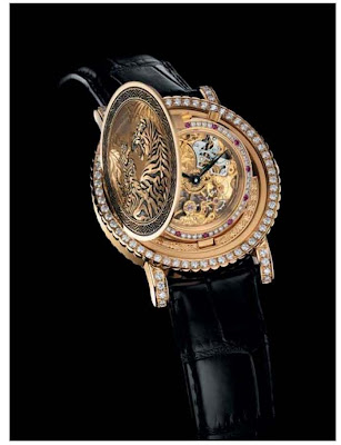 Das prächtige "Shaduli - Mère des Tigres" verfügt über ein stilvolles Handaufzugskelett, das subtil handgefertigt ist und in einem 18K Gelbgold-Gehäuse mit brillanten Diamanten und Rubinindizes untergebracht ist. Die Außenhülle ist mit brillanten Diamanten auf der Lünette besetzt und verfügt über eine gemusterte, kreisförmige Handgravur rund um das Gehäuse, die für die Uhr ein Markenzeichen ist. Auf der Rückseite ist der Fall großartig mit "Shaduli" im alten indischen Sanskrit eingraviert, um die Inspiration zu symbolisieren. Das besondere Design des Gehäuses ermöglicht es, dass die Uhr an einem schwarzen Lederarmband mit einer diamantbesetzten Butterfly-Schnalle befestigt wird, um die Armbanduhr eines Gentleman zu bilden, oder sie wird in ein 18-Karat-Goldgehäuse ausgetauscht, um eine Taschenuhr zu bilden. Mit solcher Flexibilität in Design und Exzellenz in Kunst und Handwerk,